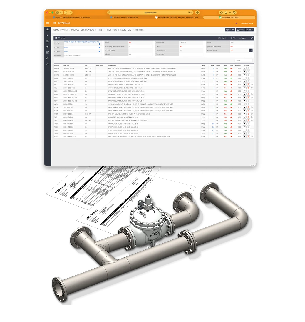 Wanneer je MTOPilot combineert met WeldPilot, ontstaat een sterk ecosysteem waarin materiaaldefinities, lasinformatie én QA/QC-documentatie perfect op elkaar aansluiten. Zo zorg je dat je materiaalplan overeenkomt met uitvoering én kwaliteitsborging — één gestroomlijnde workflow van begin tot oplevering.